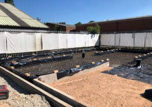 A roof is installed over the dog exercise area and becomes the covered area between Blue block and the cattery